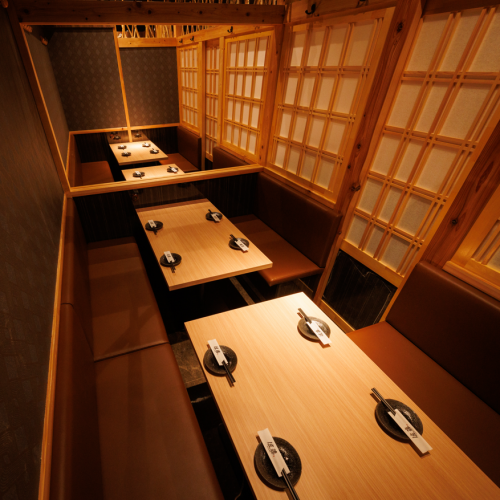 宴会個室では人数に合わせてレイアウトも自由自在!和を基調とした風情ある店内でゆったりとおくつろぎください!アクセスも良く終電ギリギリまでOK!全席完全個室!2名様~OK♪◆店内・個室席のご紹介◆店内に散りばめられた間接照明は、静かな脇役ながらも、和の趣を感じさせてくれます。安心感と温かみをお届け致します